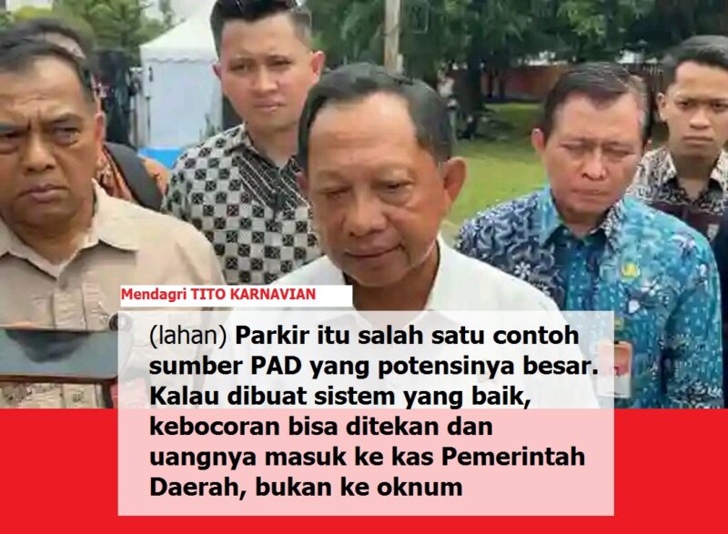 ” (lahan) Parkir itu salah satu contoh sumber PAD yang potensinya besar. Kalau dibuat sistem yang baik, kebocoran bisa ditekan dan uangnya masuk ke Kas Pemerintah Daerah, bukan ke oknum.” | Tito Karnavian.