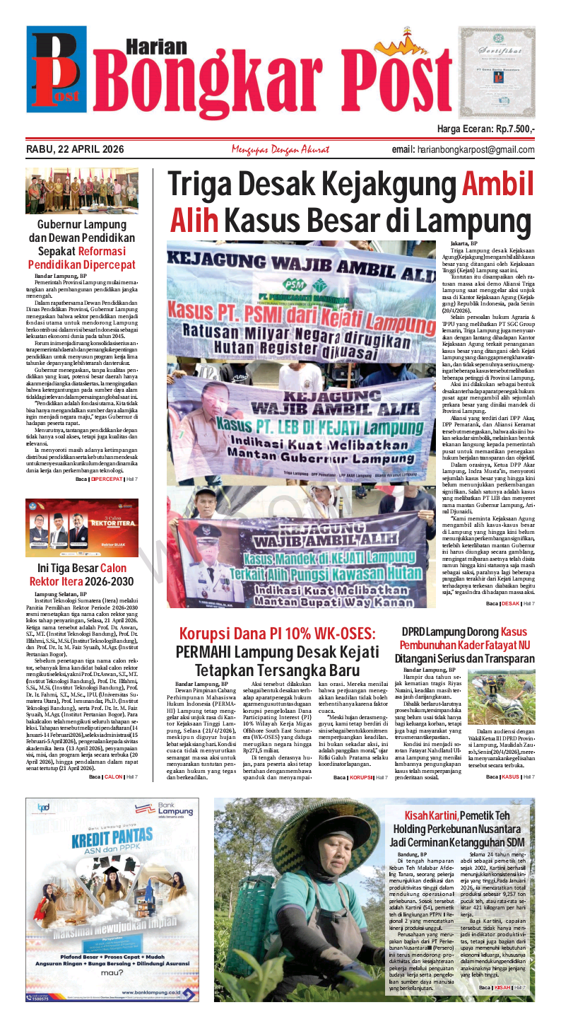 TRIGA Desak Kejagung Ambil Alih Kasus Besar di Lampung Mangkir Sekali, Arinal Kembali Dipanggil Kejati Lampung Hari Ini Unila Gelar Pasca Sarjana 2026/27 Mirza-Jihan Kompak Daftar Harga Pangan Timpang, Gubernur Ungkap Rantai Distribusi yang Panjang Jadi Tantangan Hotman Paris Jadwalkan Pertemuan dengan Ibu Korban Dugaan Pemerkosaan Calon Polwan Jambi Hari Ini