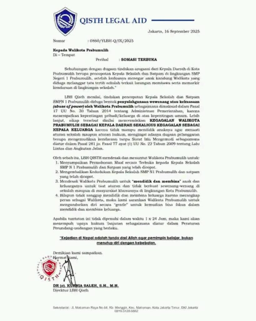 “Dari empat tuntutan Somasi kami, dua dipenuhi, dua dibiarkan. Kami hanya ingin Walikota belajar menjadi bukan sekadar Kepala Daerah, tapi juga Kepala Keluarga yang bisa menuntun, bukan menutup mata.” tulisnya lewat unggahan akun fb @KurniaSaleh, Rabu ( 17/9/2025).