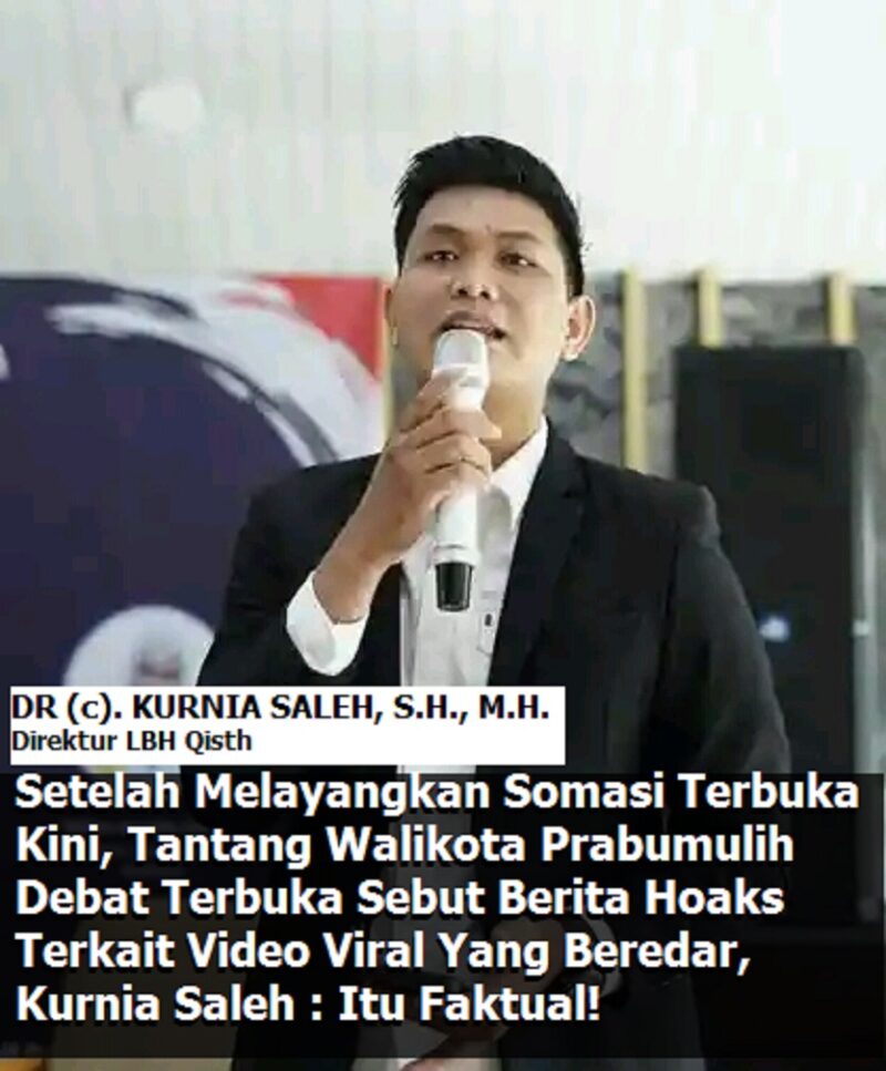 Terpisah, menanggapi klarifikasi Walikota Prabumulih, Kurnia Saleh ahli hukum termuda sekaligus direktur LBH Qisth, sebelumnya telah melayangkan Somasi Terbuka buat Walikota Prabumulih. Ia menyatakan video yang beredar luas di jagat maya hingga viral! adalah faktual. Dan, Kurnia akan membuktikannya dengan menantang debat terbuka kepada Walikota Prabumulih.
